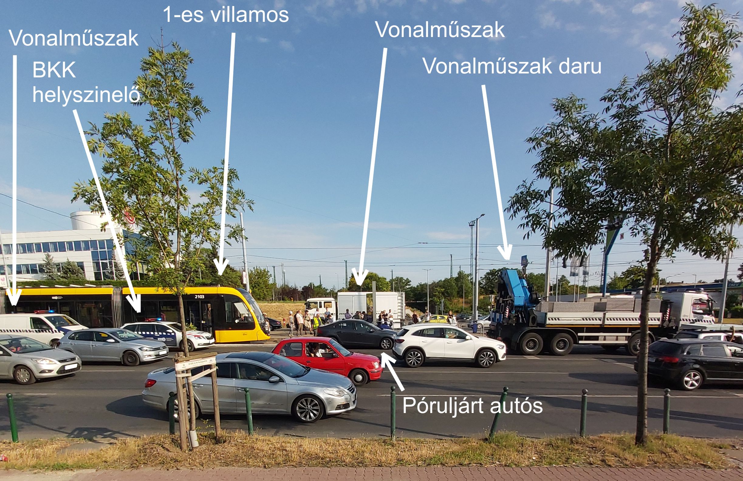 Elsőnek a BKK ügyeletes érkezett, majd a citrompótlók és végül a teljes villamos vonalműszak-nehézlovasság három gépjárművel.