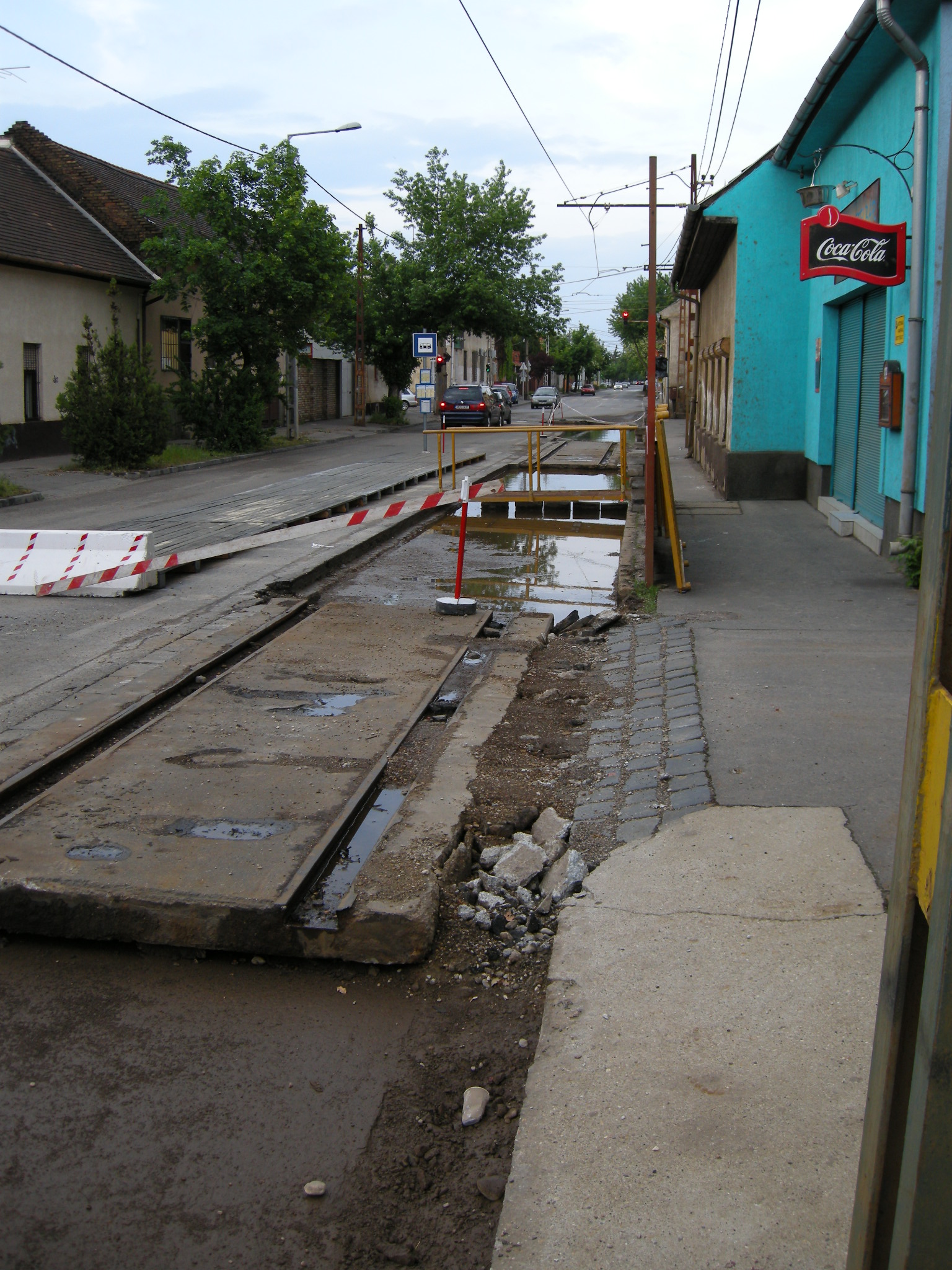 Azt láttuk, hogy a paneleket vizes alapra (eső után) rakták le, lásd a képet. Ha az aljzat a panel alatt még nem száradt meg, akkor (40t villamos és 40t buszforgalom hatására) a döngölt aljzat a panellel együtt megsüllyedhet, a pálya és az úttest egyenletlenné válhat, később pedig a panel megrepedhet, majd még később kettétörhet.